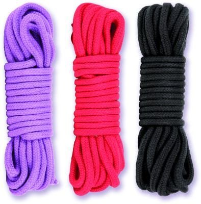 Enjoy the sublime and beautful pleasures of restraint with this Japanese style bondage rope. Also known as Kinabuku (“bondage”), or Kinabuku-bi (“erotic/beautiful” bondage), Japanese rope bondage dates back hundreds of years to some of the darker days of feudal Japan. Originally used as punishment or torture, the technique eventually grew into a respected art form and means of erotic delight. Rope bondage titillates both the mind and body, exerting indirect and direct pressure on erogenous zones, squeezing the areas, but also dispersing the force of the rope throughout the entire body, creating an engulfing sense of immobility. As well, complete or partial restraint combined with a careful attention to intricacy makes this style of bondage exquisite to the eye as well as the touch. Aside from the minute differences between western and Japanese techniques, styles continue to emerge and change as each user brings their own vision and flair to the tradition. Unlike most synthentic ropes that tend to be too slippery this 32-foot long cotton rope will retain its tensile strength without chafing or irrating the skin, and comes in a variety of colors: red, black, or purple. A knot instruction brochure is also included.